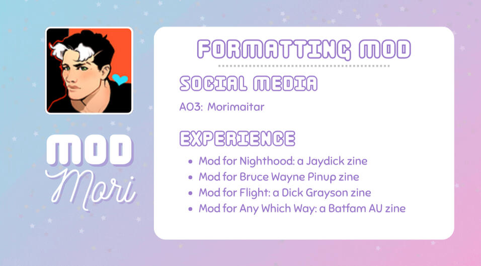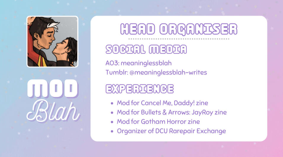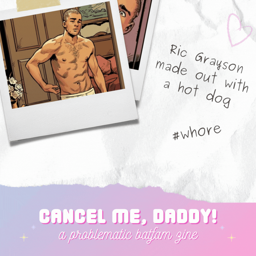 Not Now, Kitten... is a Batfamily zine celebrating “problematic” content. It is a sequel to the 2021 Cancel Me, Daddy! zine. The aim of this zine is to explore and celebrate dark themes while reinforcing the integrity of darkfic.It is incredibly important to the zine organizers that Not Now, Kitten... supports and uplifts marginalized groups. Content that is bigoted or in poor taste will not be accepted for the zine.The proceeds of this zine will be donated Thorn, an international anti-human trafficking organization that works to address the sexual exploitation of children..Not Now, Kitten... will be a NSFW zine, and will include explicit content not suitable for minors. By nature, some content may be confronting, and warnings will be provided in the zine for readers. Readers are expected to exercise discretion.To read more about the zine, please visit the link below.
